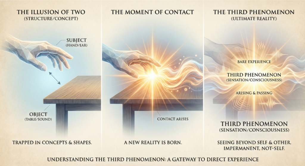 In daily life, we are trapped in the concept of “ structure” . We see a solid “ I” interacting with solid “ objects.” To break this illusion and see anattā (not-self), we must perceive the Third Phenomenon that arises at the moment of contact.